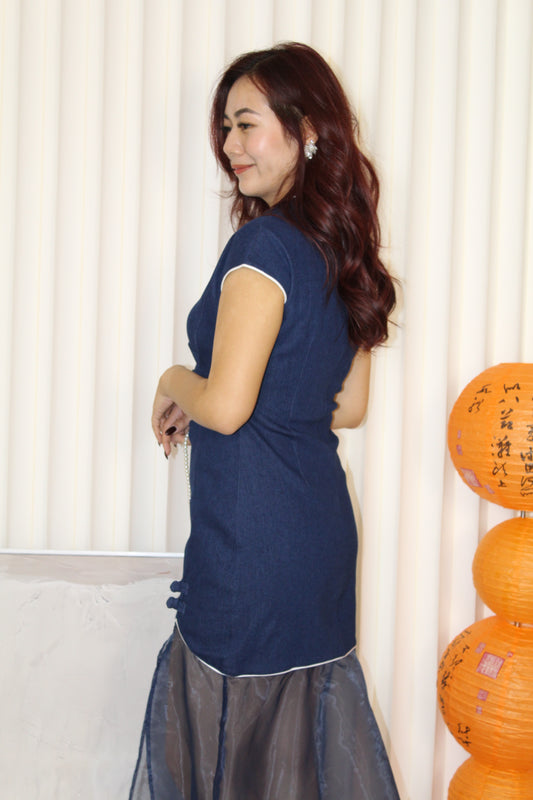 Ruhan Denim Cheongsam Midaxi Dress (Dark Blue)