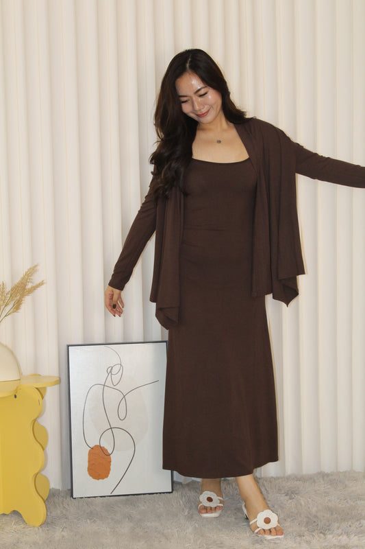 Ysee Cardigan Two Piece Dress Set (Brown)